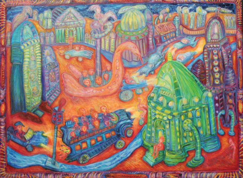 This painting is not just a visual feast; it initiates conversation and inspires creativity. Whether displayed in a living room, studio, or gallery, “City of Whimsy“ serves as a stunning focal point, sparking curiosity and delight among all who encounter it.