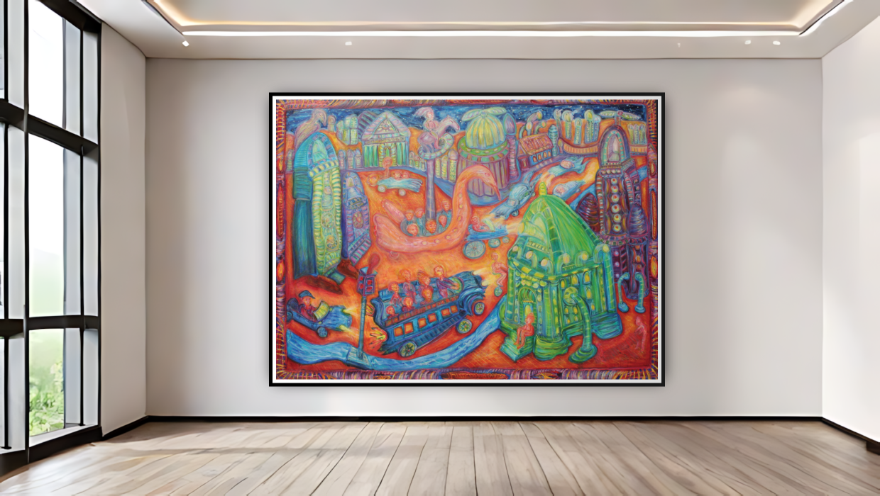 Dive into a world of imagination with “City of Whimsy: A Vibrant Odyssey.“ This 8ft x 6ft oil painting transforms your environment into a captivating wonderland, blending elements of reality and fantasy. Eye-catching colors explode across the canvas, creating a tapestry of emotion that draws the viewer in.