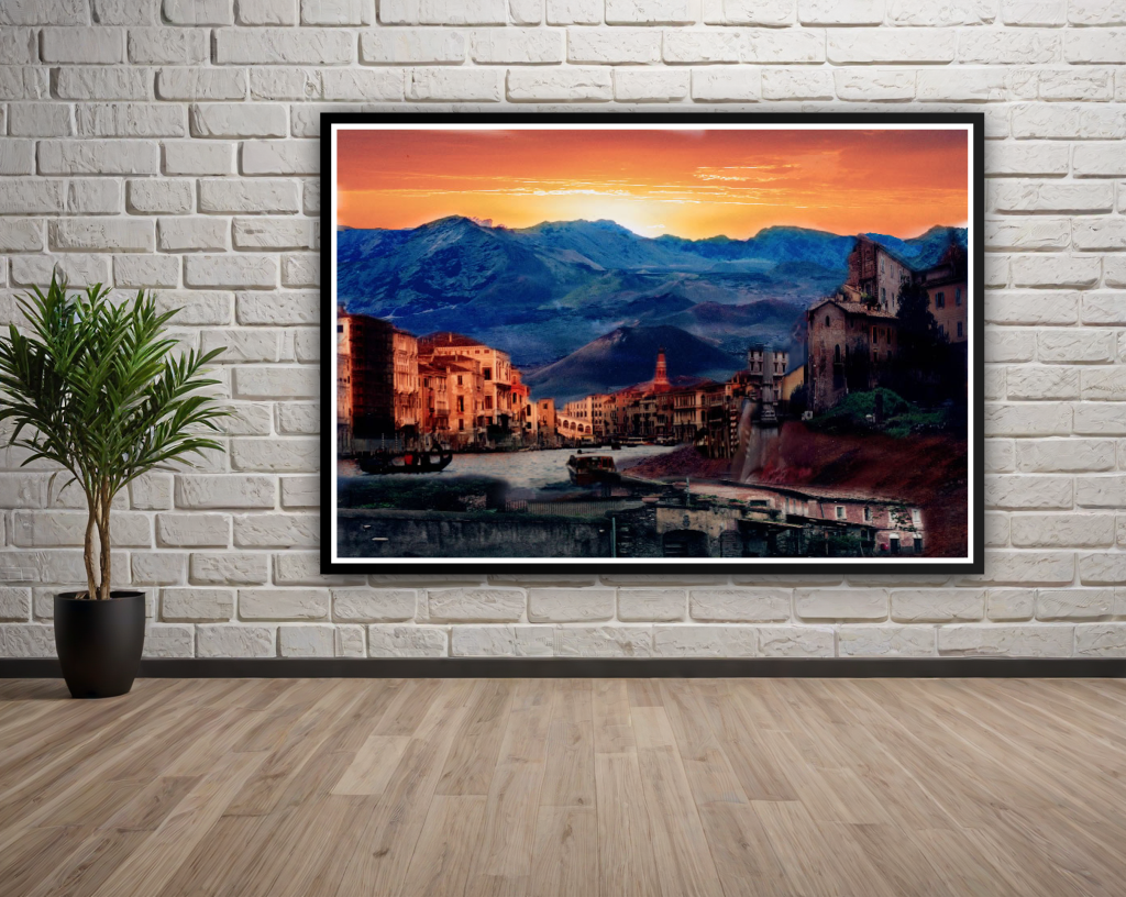 Discover “Eternal Horizons,” a stunning digital artwork that harmonizes the vivid, rolling vistas of Haleakala with the iconic charm of Venice. Measuring 12 inches by 9 inches, this piece captures the essence of two remarkable locations, transporting you to a realm where the majestic mountains dance gracefully with tranquil waterways.