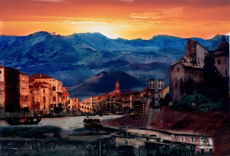 In this artwork, the warm hues of a setting sun cast a golden glow over the serene landscapes, inviting contemplation and tranquility. The dramatic cliffs of Haleakala rise majestically in the background, their volcanic beauty juxtaposed against the architectural wonders of Venice. You can almost hear the distant lapping of water against gondolas, faint whispers of the past echoing through the narrow alleys.