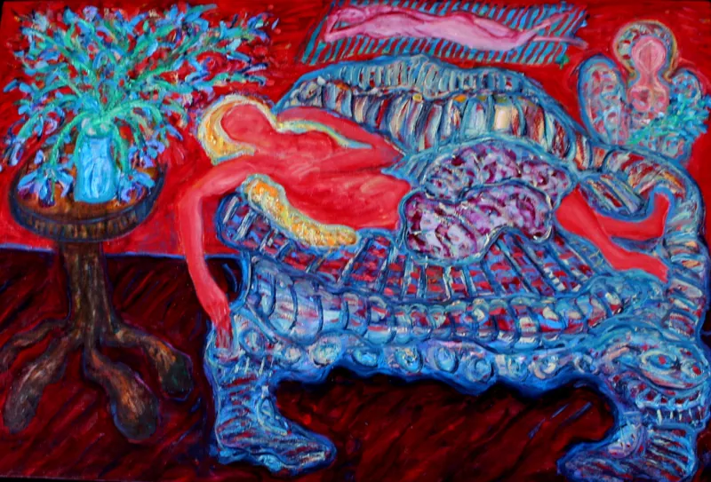 “Repose in Color” invites viewers into a captivating scene, where a figure enjoys a moment of peace on an intricately designed sofa. The bold reds and blues evoke a sense of warmth and comfort, while the playful strokes and whimsical textures add depth and intrigue. A striking bouquet in a glass vase offers a refreshing touch of nature, contrasting beautifully with the rich tapestry of colors surrounding the resting figure. Measuring 12 inches by 9 inches, this small yet impactful piece is perfect for enhancing any space, from a cozy nook to a vibrant gallery wall. Celebrate the art of relaxation and the beauty of color with this unique oil painting, ideal for collectors and art lovers alike.
