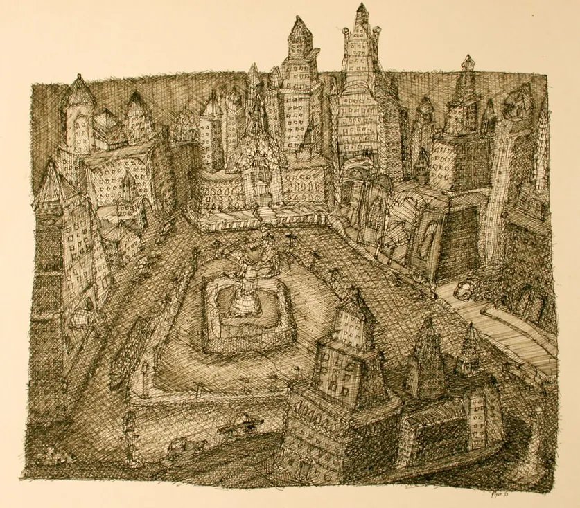 The layering of texture and the play of light and shadow create a compelling depth, allowing viewers to lose themselves in the labyrinth of structures and pathways. Perfect for art enthusiasts and collectors alike, this drawing serves as a conversation starter and a window into a fantastical world, making it an ideal addition to any home or office space.