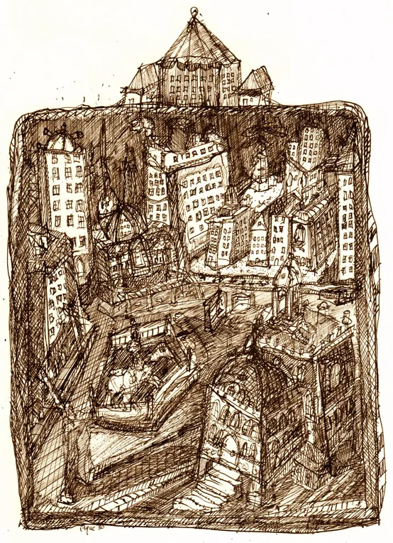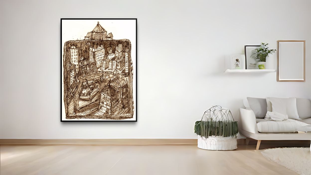 Meticulously crafted, this piece challenges conventional perspectives, showcasing a whimsical cityscape with towering rooftops and meandering alleyways. The sepia-toned ink adds depth and warmth, inviting you to explore every nook and cranny of this vibrant urban landscape.